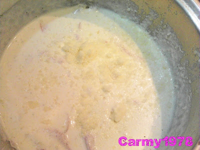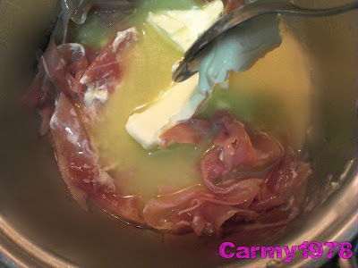 A questo punto in un pentolino,mettiamo a soffriggere l'olio con il burro ed il prosciutto (tagliato a pezzetti),poi aggiungiamo la panna e due cucchiai di latte e mescoliamo per bene.