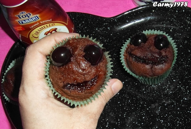 Ho decorato una parte dei muffin con le amarene e il top al caramello della Fabbri, andando a creare una sorta di viso.